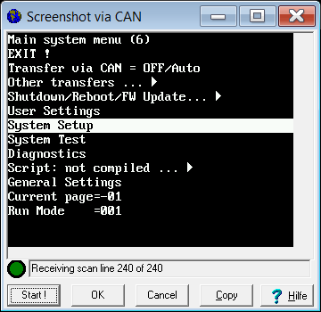 After preparing the terminal for remote control operation (as explained in the previous chapter), press F12 in the remote terminal program once or twice, to enter the display's system menu (which replaces pressing F2+F3 simultaneously on a device with a real keyboard).