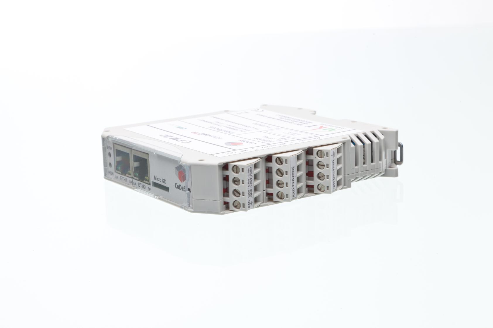 Die mit CODESYS V3.5 (IEC-61131-3) programmierbare Steuerung für die Hutschienenmontage integriert einen EtherCAT-Master und einen CANopen-Master/Slave.